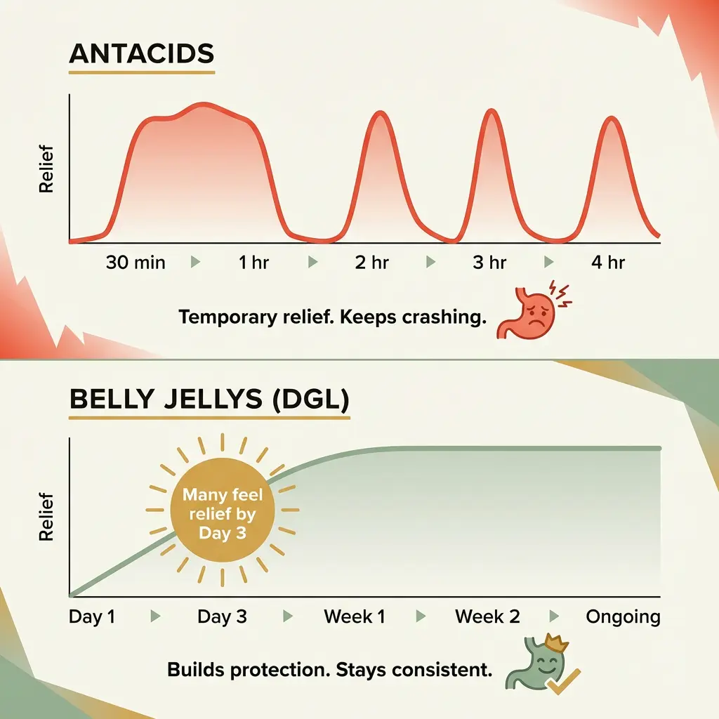 But here's the beautiful part: The benefits actually increase over time. While antacids become less effective (your body fights back by producing MORE acid), DGL helps restore your body's natural balance.