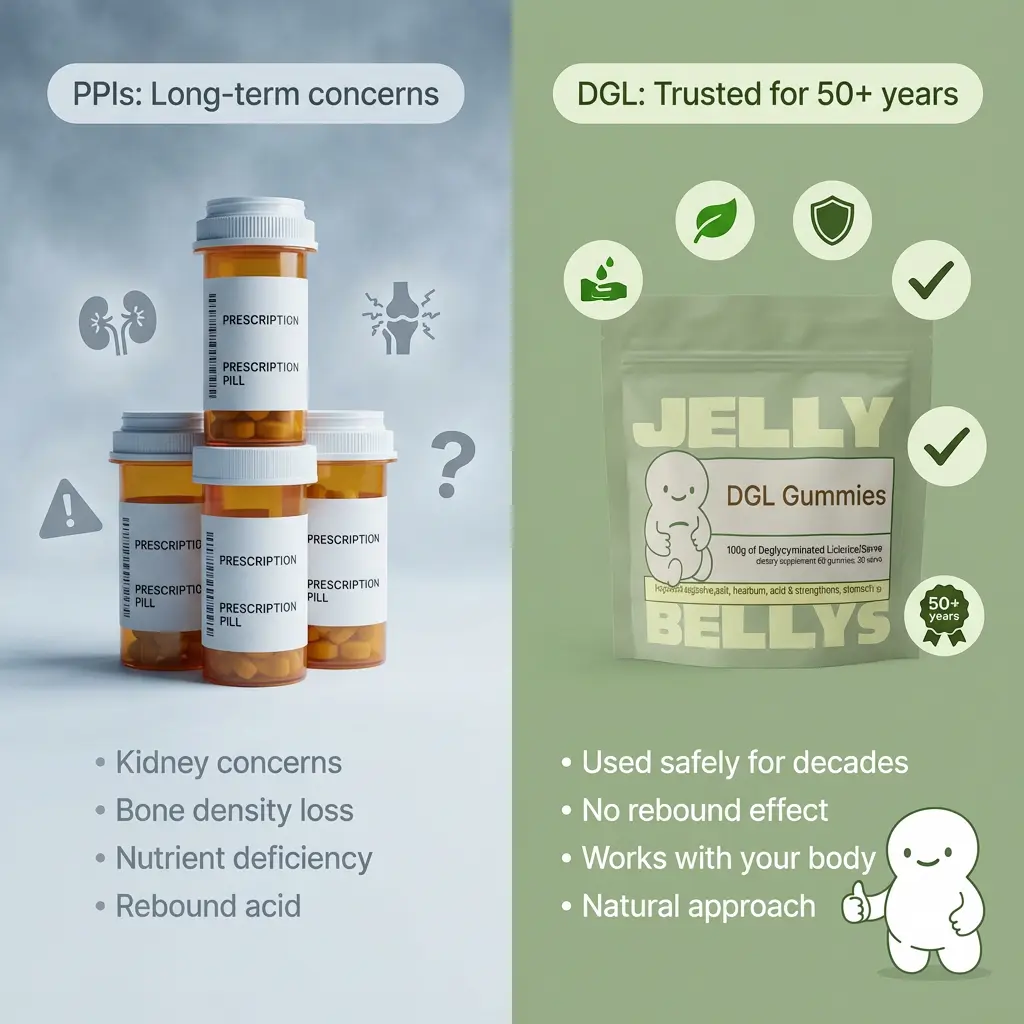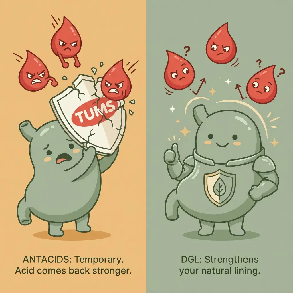 DGL works completely differently. Instead of eliminating acid, it helps your body handle it better by strengthening your natural defenses. It's like the difference between turning off your sprinkler system vs. waterproofing your house.